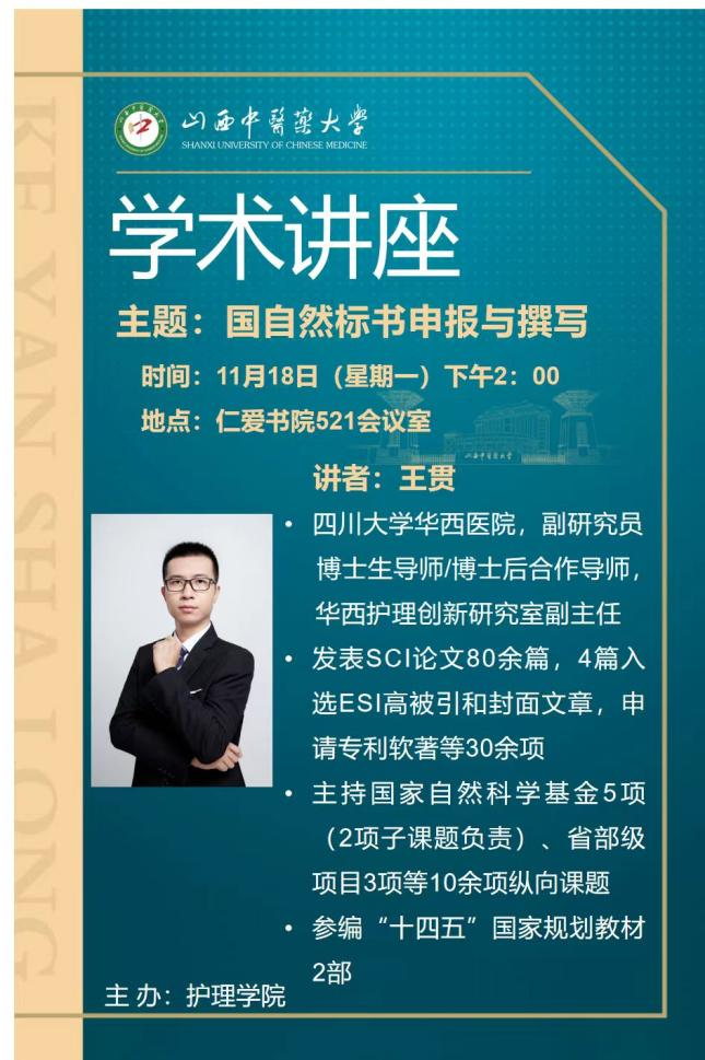 11月18日下午,德赢AC米兰中国官方网站邀请四川大学博士生导师王贯教授在仁爱书院作了题为“国自然标书申报与撰写”的讲座。杨支兰副院长主持,德赢AC米兰中国官方网站全体教师及研究生参加学习。