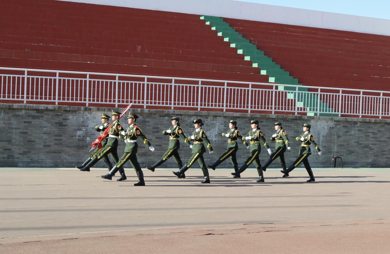 在激昂的《义勇军进行曲》中,国旗护卫队迈着铿锵有力的步伐护送国旗入场,五星红旗冉冉升起,全体师生肃立行注目礼,表达对祖国的无限忠诚与热爱。