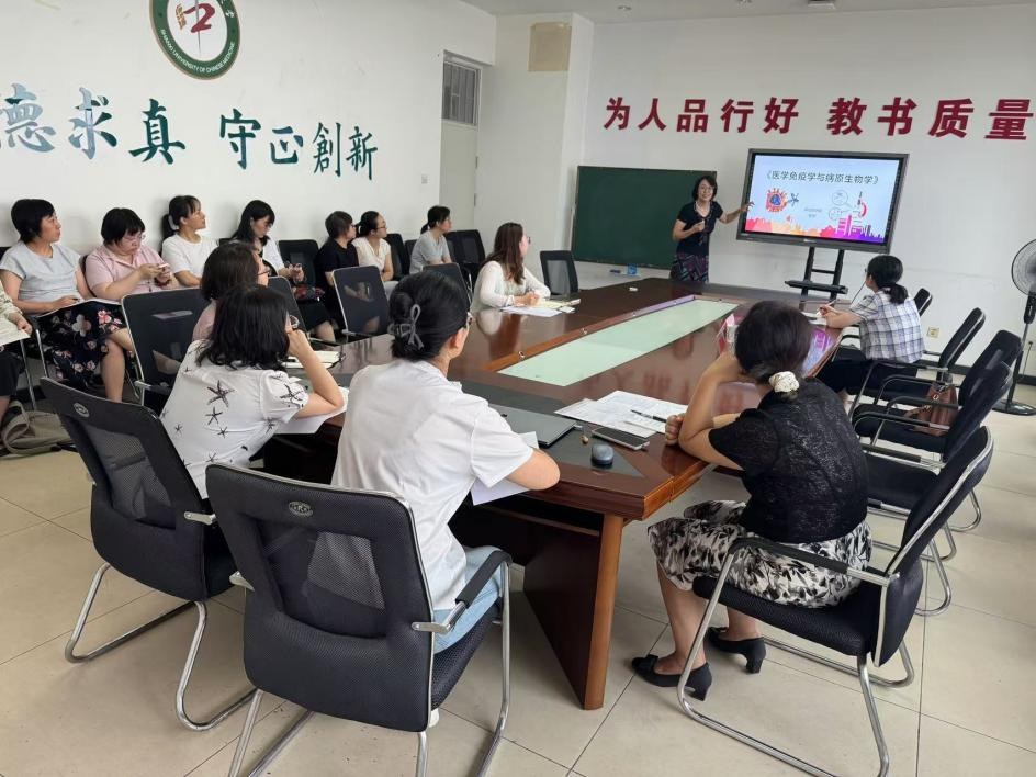 此外,学院特别邀请基础医学院贾璐副教授开展了示范教学。贾璐副教授以病毒复制的六个步骤为主线,层层递进、环环相扣,板书以思维导图形式构建出完整的知识闭环,帮助学生建构系统认知。通过引入阻断病毒复制的临床药物应用案例,拓展了知识广度,激发学生主动参与和深入思考。课程中还巧妙融入AI辅助教学工具,有效提升了课堂趣味性与互动性。